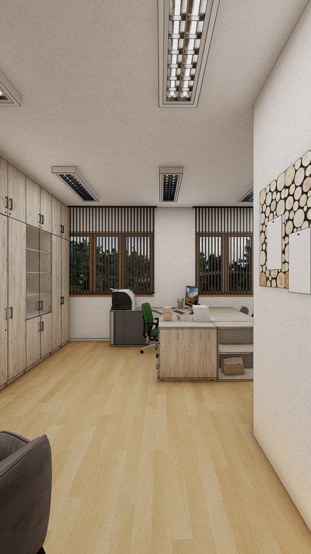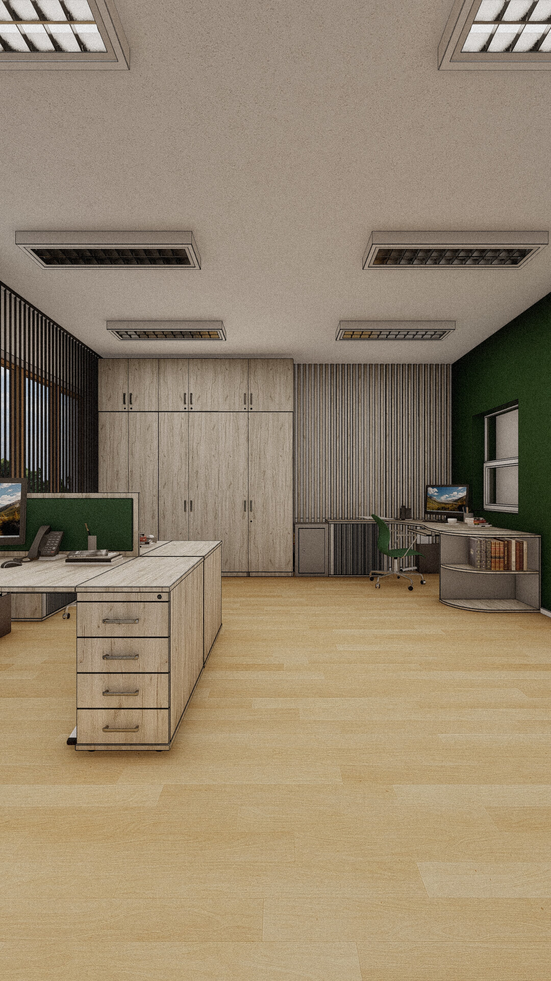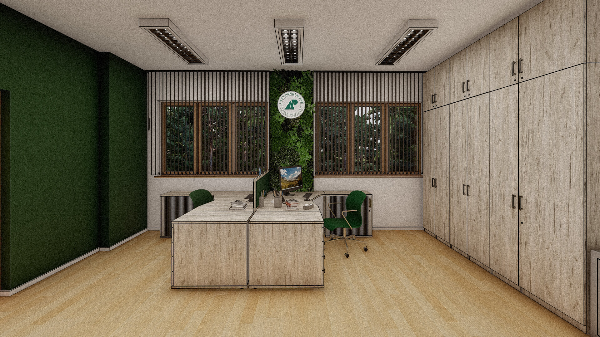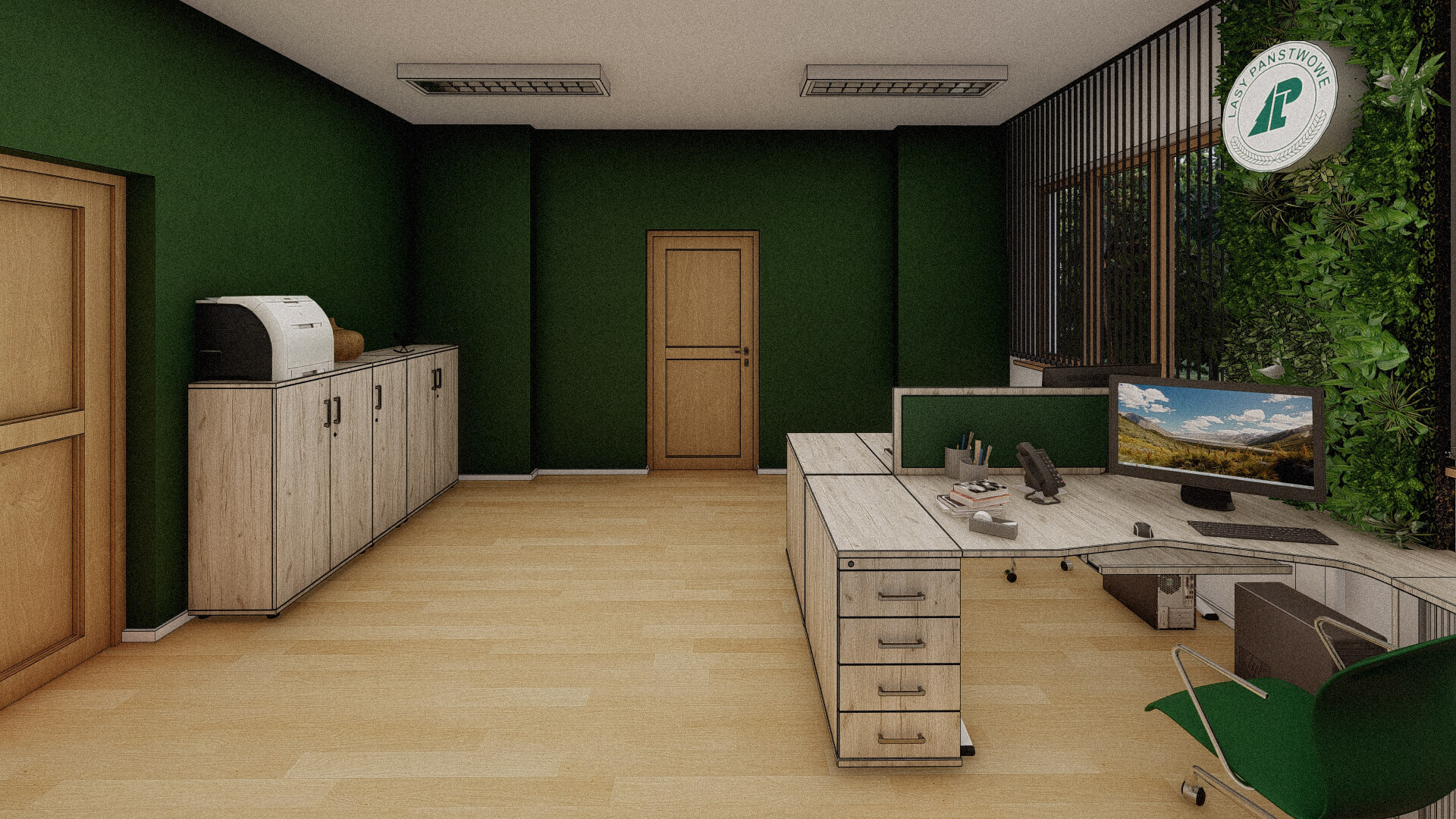 Projekt biura Nadleśnictwa łączy nowoczesną funkcjonalność z estetyką inspirowaną naturą. Wnętrza utrzymano w stonowanej palecie zieleni, jasnego drewna i neutralnych barw, co sprzyja skupieniu i komfortowi pracy. Przemyślany układ przestrzeni zapewnia ergonomiczne stanowiska pracy, czytelny podział stref oraz wygodną obsługę interesantów. Całość tworzy spójne, reprezentacyjne i przyjazne środowisko, podkreślające charakter instytucji związanej z ochroną lasów.