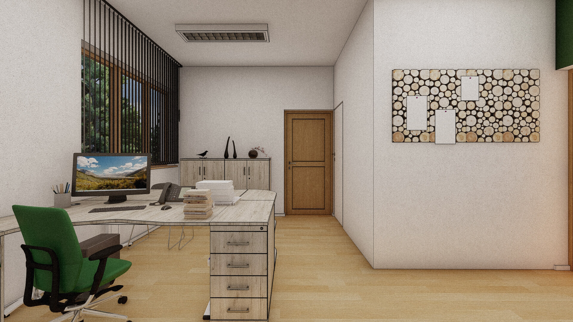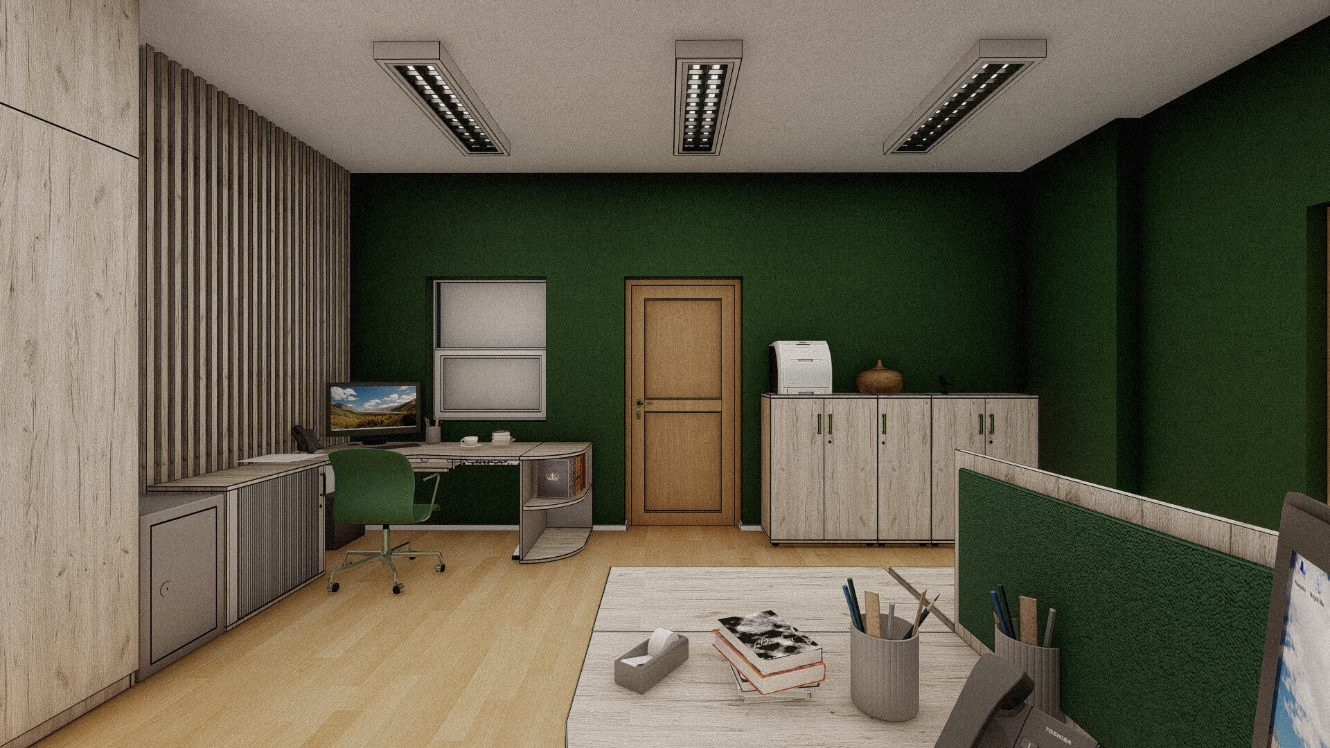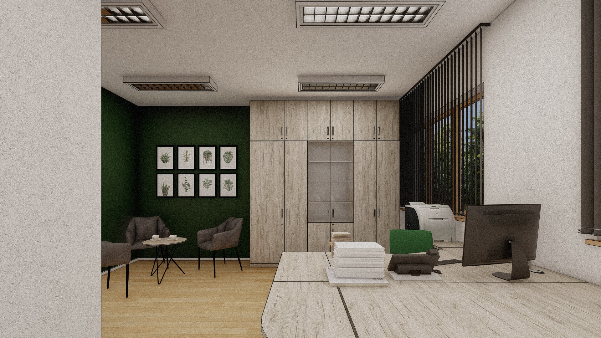 Projekt biura Nadleśnictwa łączy nowoczesną funkcjonalność z estetyką inspirowaną naturą. Wnętrza utrzymano w stonowanej palecie zieleni, jasnego drewna i neutralnych barw, co sprzyja skupieniu i komfortowi pracy. Przemyślany układ przestrzeni zapewnia ergonomiczne stanowiska pracy, czytelny podział stref oraz wygodną obsługę interesantów. Całość tworzy spójne, reprezentacyjne i przyjazne środowisko, podkreślające charakter instytucji związanej z ochroną lasów.