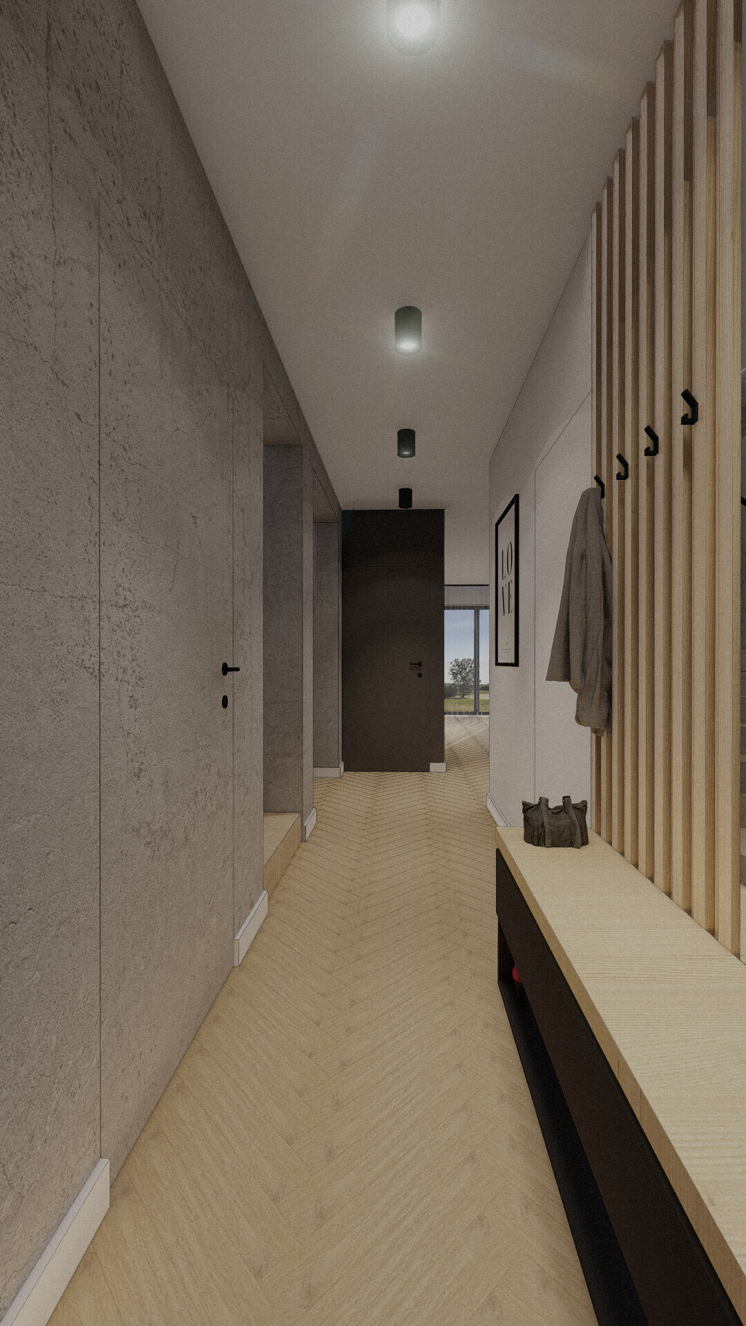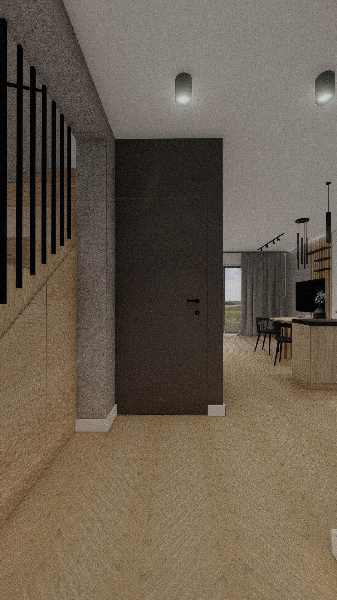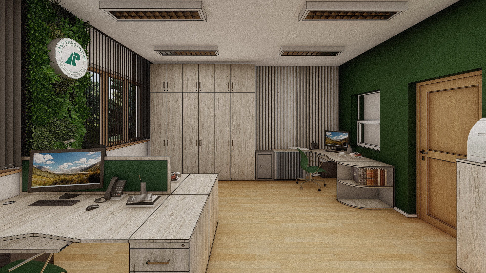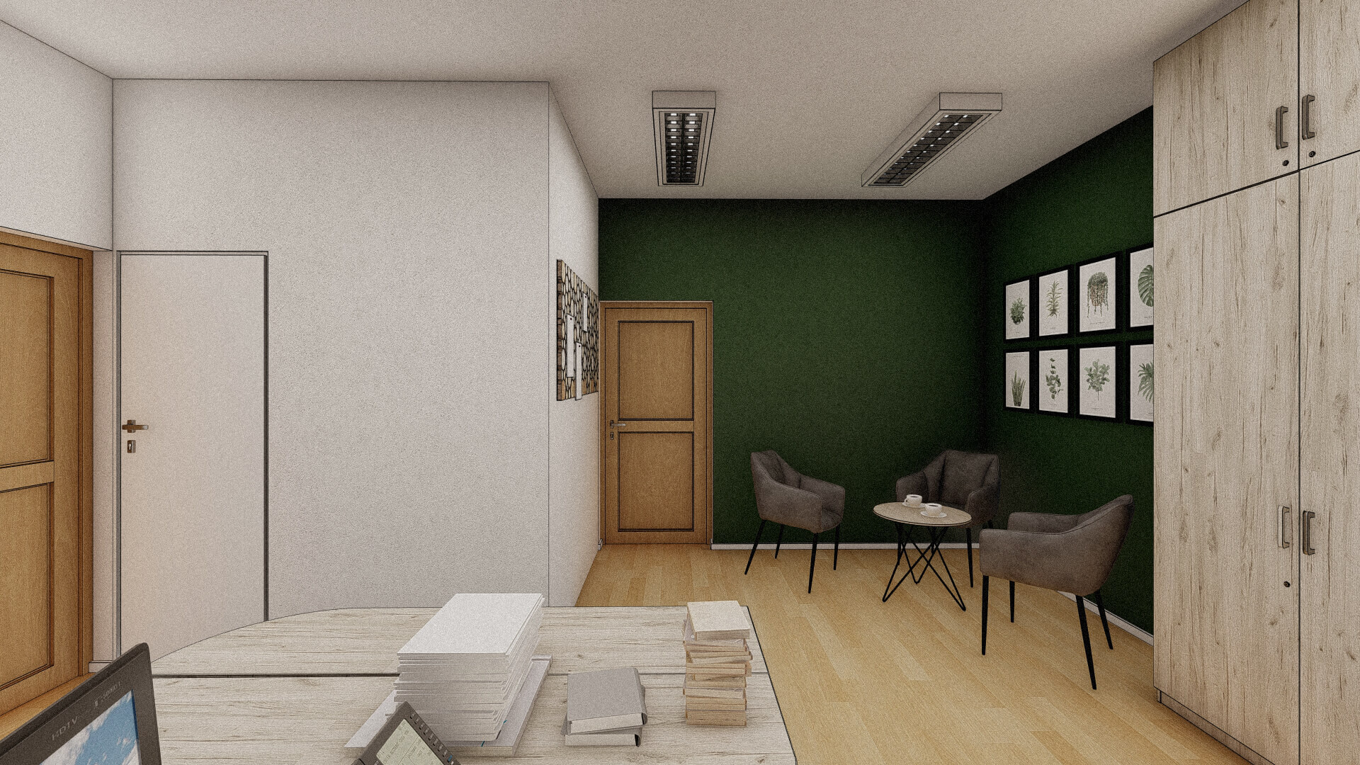 Projekt biura Nadleśnictwa łączy nowoczesną funkcjonalność z estetyką inspirowaną naturą. Wnętrza utrzymano w stonowanej palecie zieleni, jasnego drewna i neutralnych barw, co sprzyja skupieniu i komfortowi pracy. Przemyślany układ przestrzeni zapewnia ergonomiczne stanowiska pracy, czytelny podział stref oraz wygodną obsługę interesantów. Całość tworzy spójne, reprezentacyjne i przyjazne środowisko, podkreślające charakter instytucji związanej z ochroną lasów.