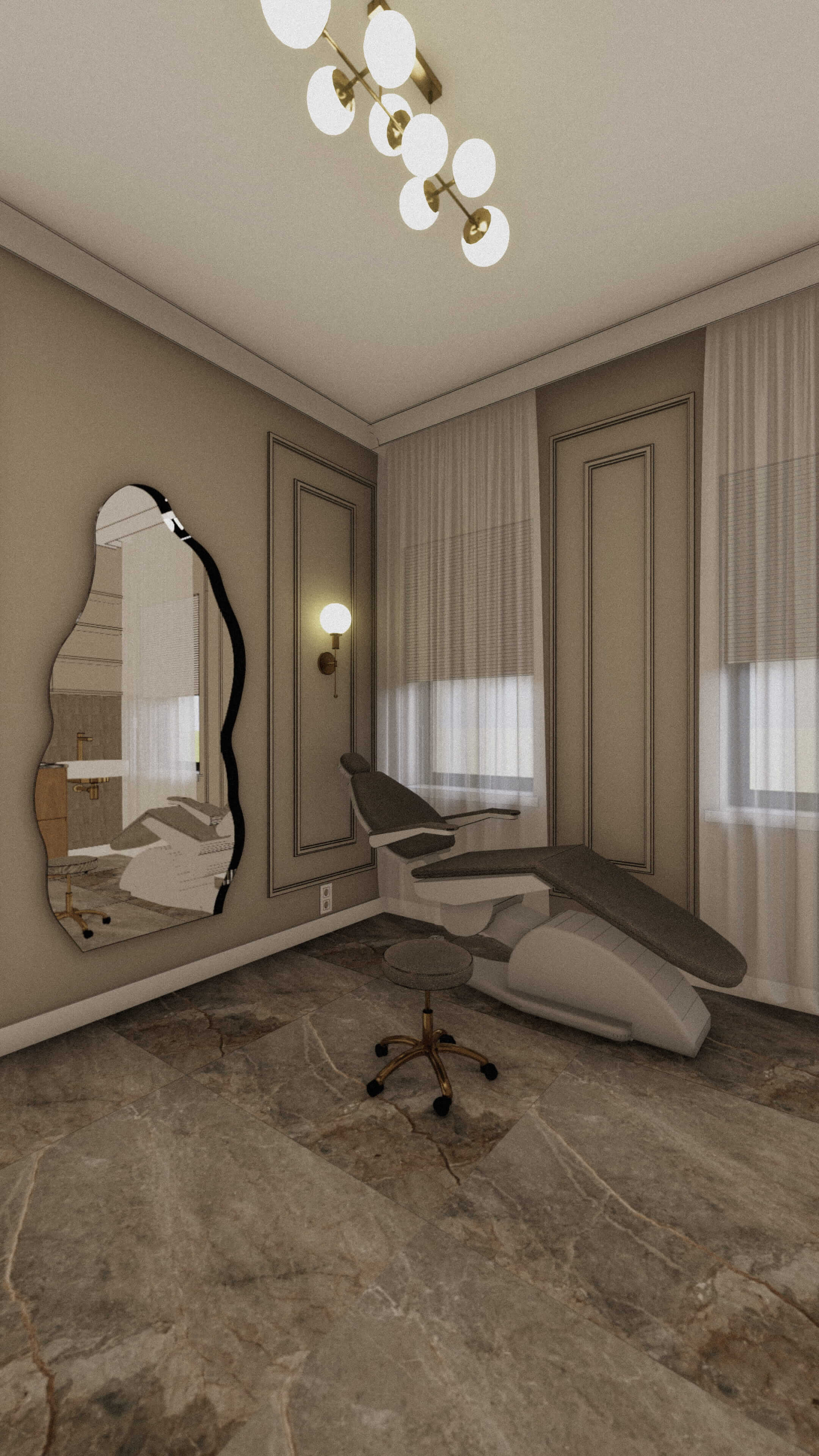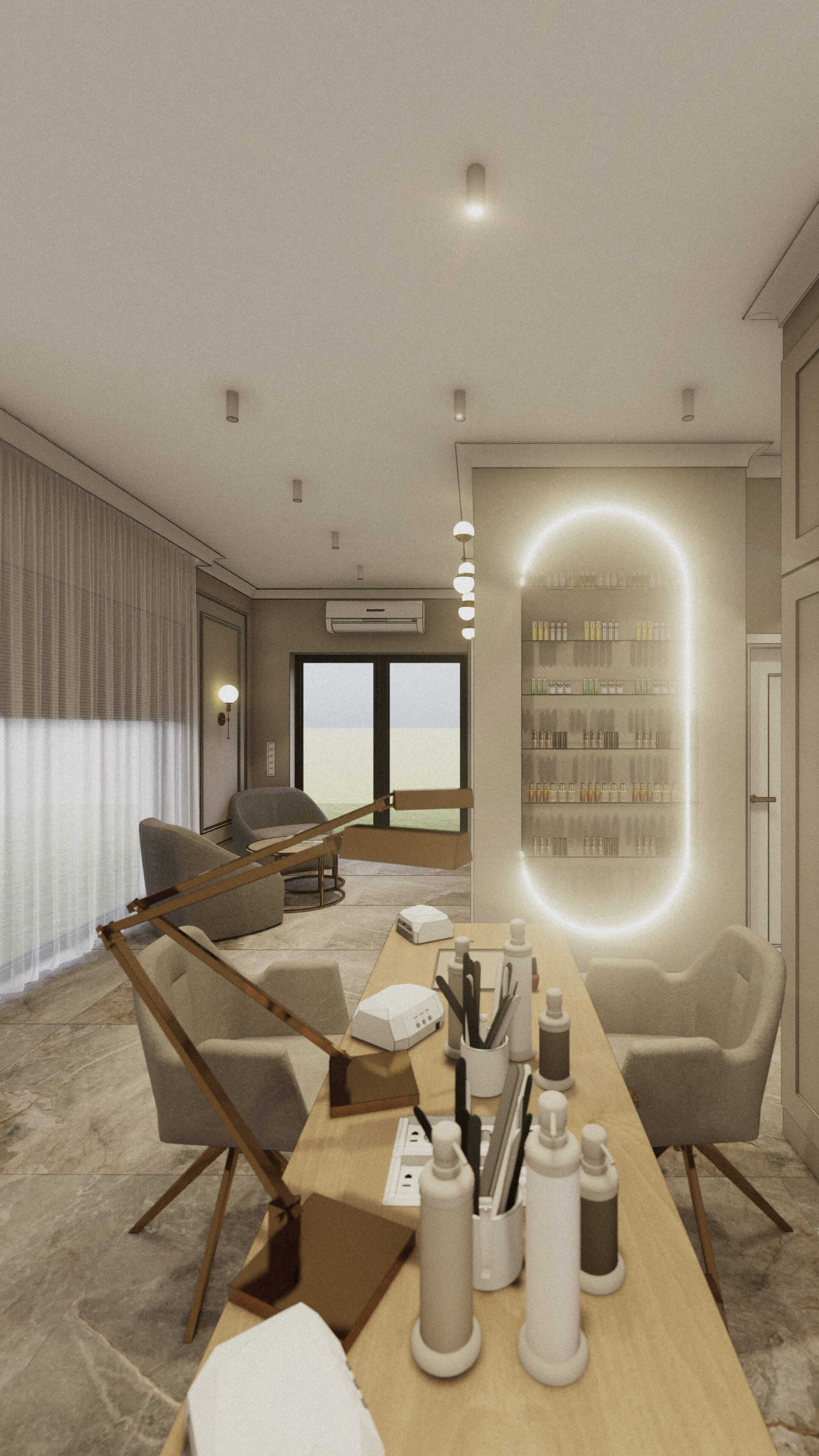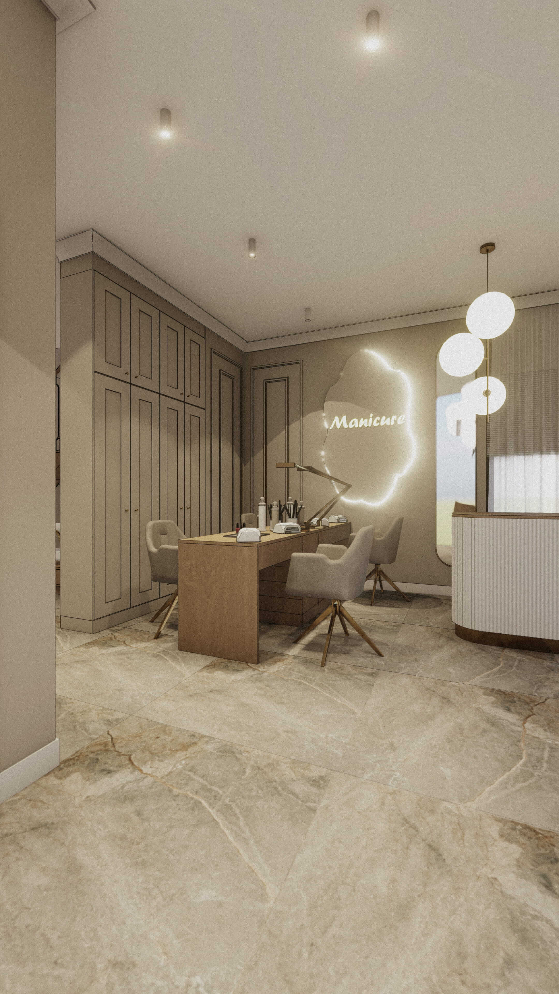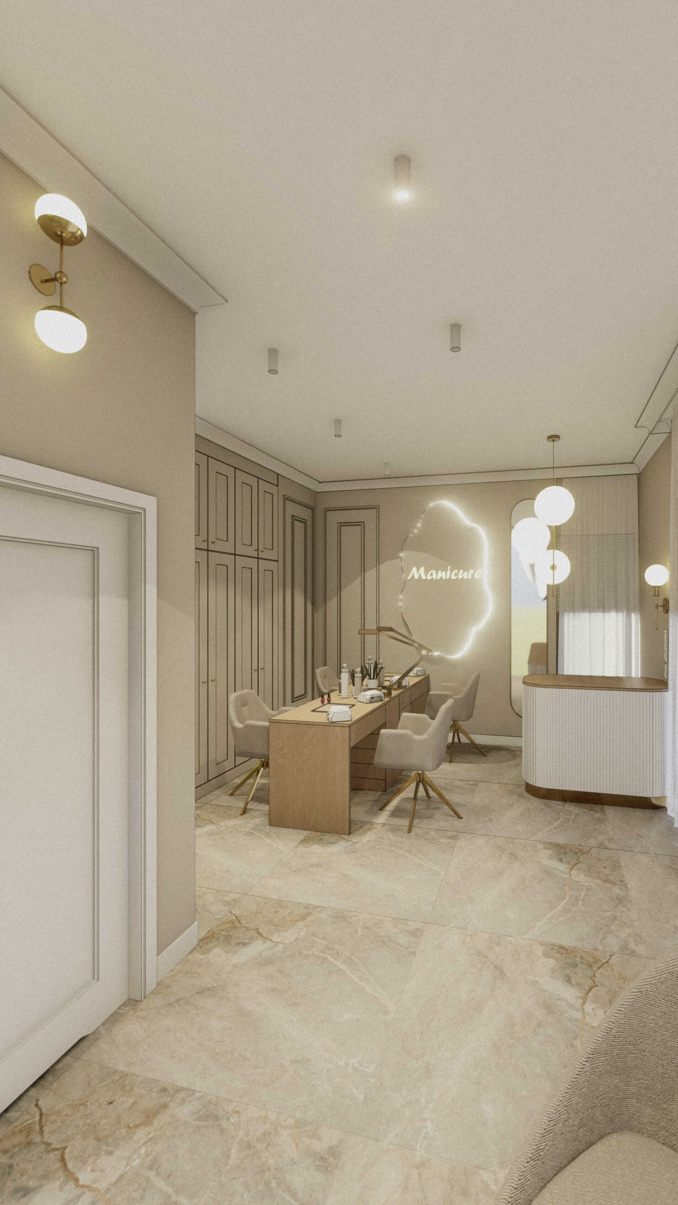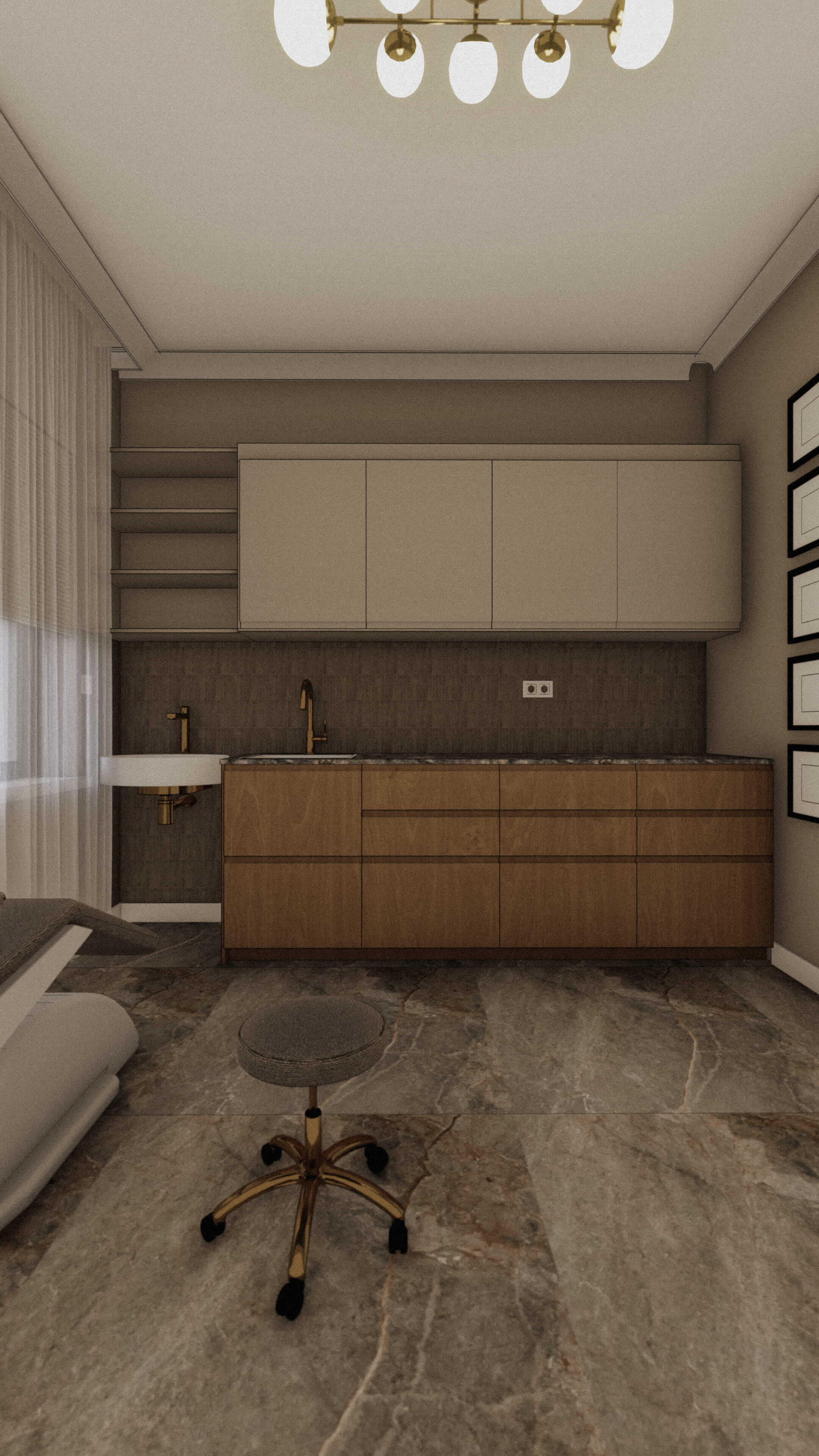 To elegancki gabinet będący wyraźną odskocznią od klasycznych bieli i różów w branży beauty. Nowoczesna kolorystyka, kamienne wykończenia i złote akcenty tworzą wnętrze z klasą, ale i charakterem. Przestrzeń jest spokojna i luksusowa, a jednocześnie zapadająca w pamięć. To projekt dla marek, które chcą wyróżnić się elegancją z pazurem.