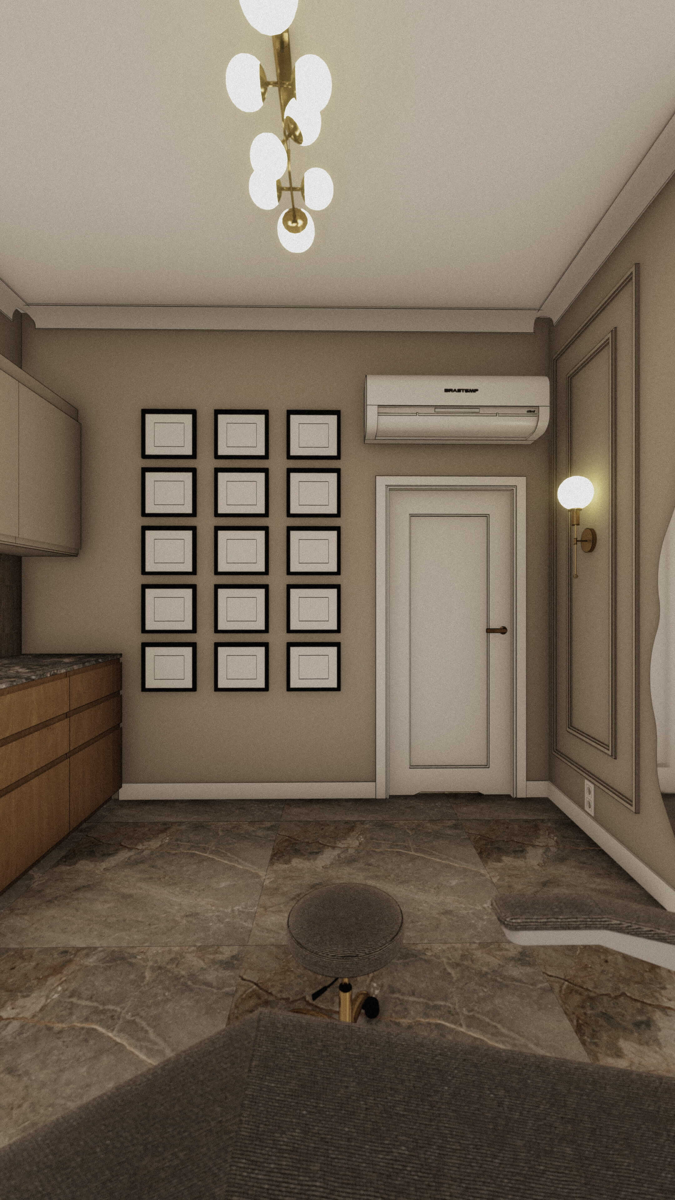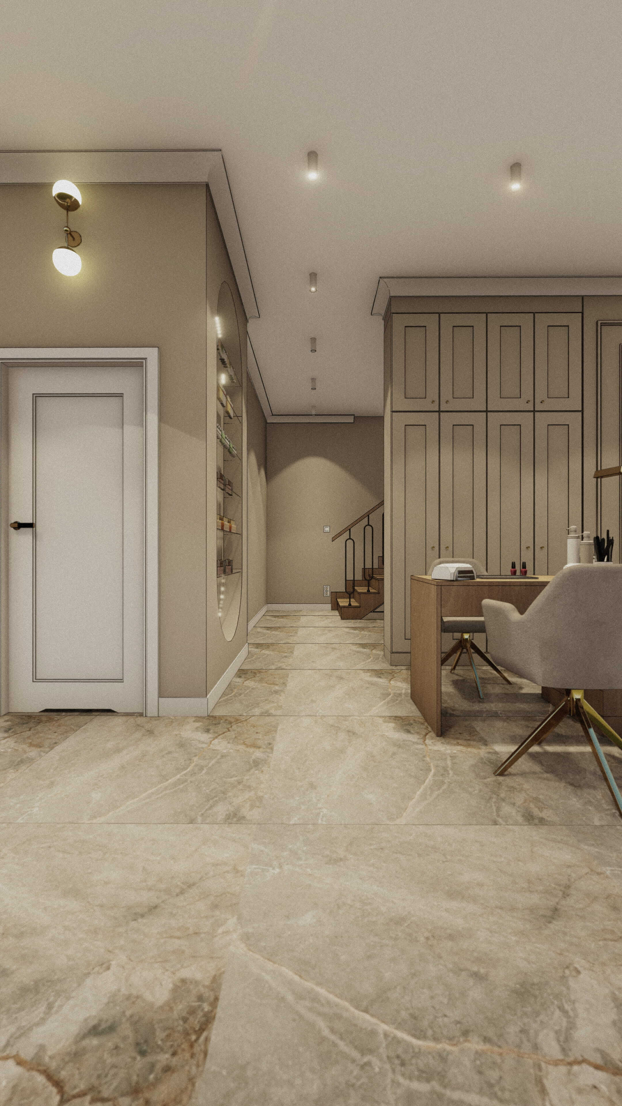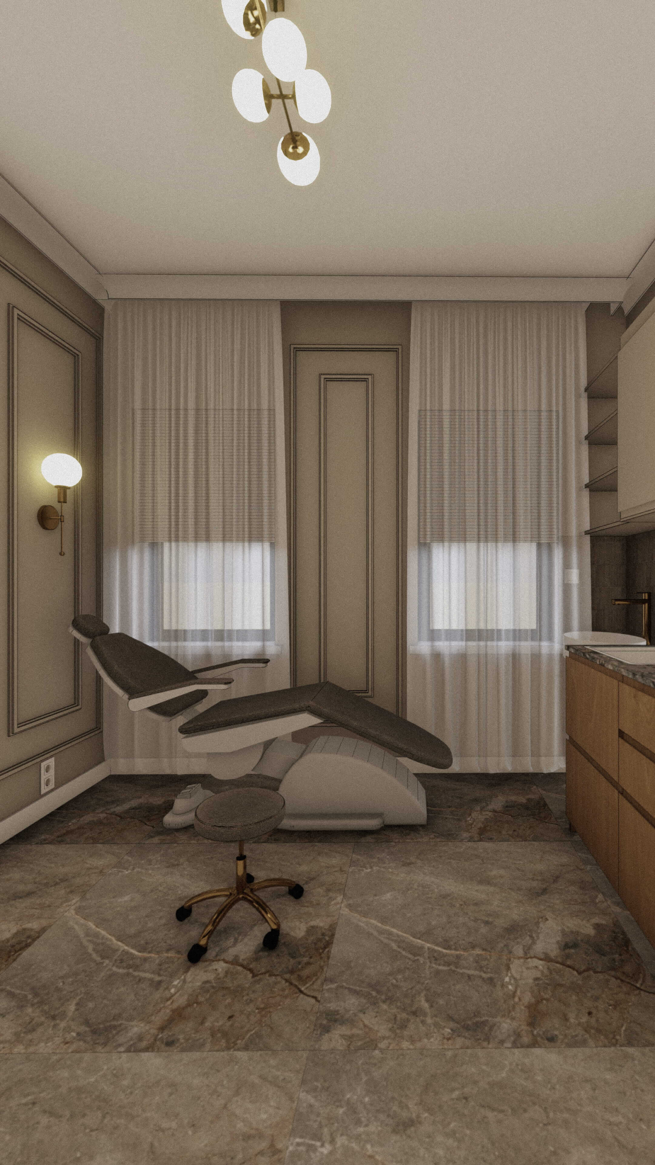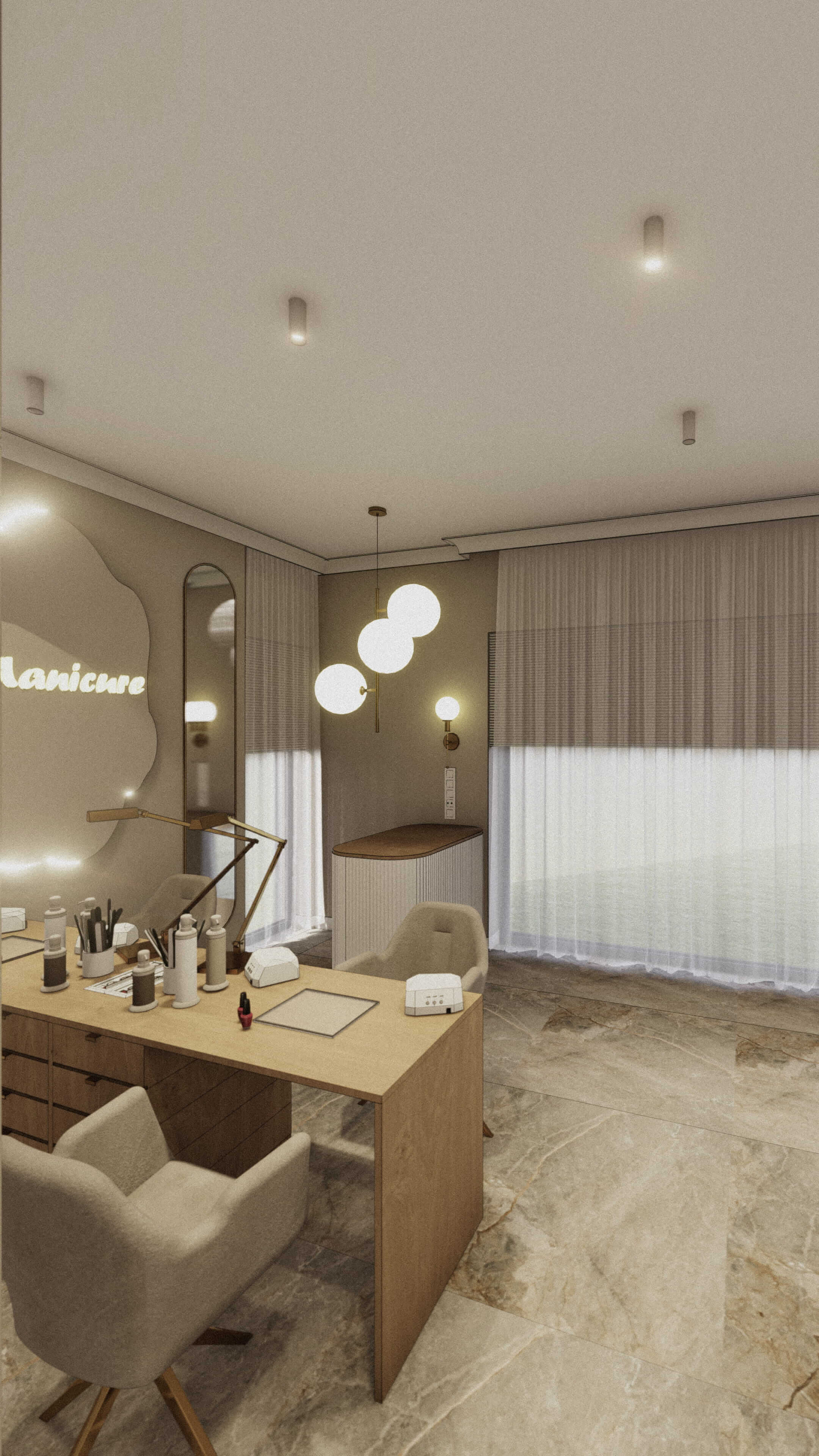 To elegancki gabinet będący wyraźną odskocznią od klasycznych bieli i różów w branży beauty. Nowoczesna kolorystyka, kamienne wykończenia i złote akcenty tworzą wnętrze z klasą, ale i charakterem. Przestrzeń jest spokojna i luksusowa, a jednocześnie zapadająca w pamięć. To projekt dla marek, które chcą wyróżnić się elegancją z pazurem.