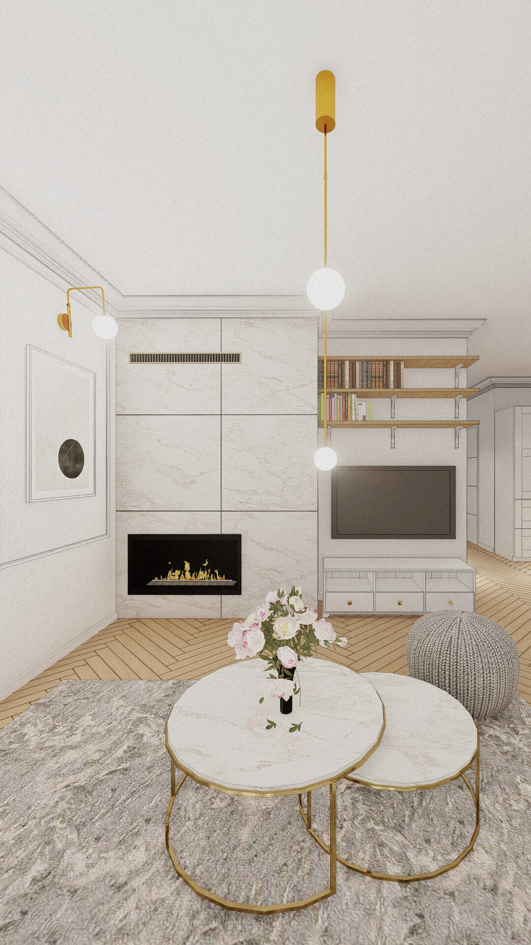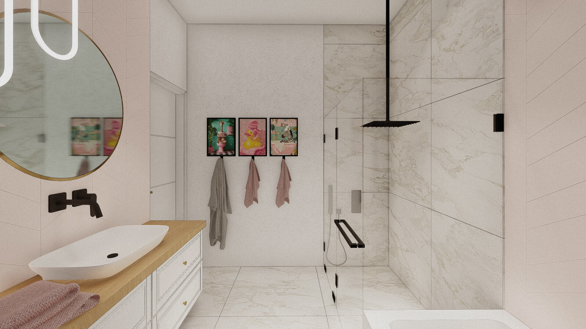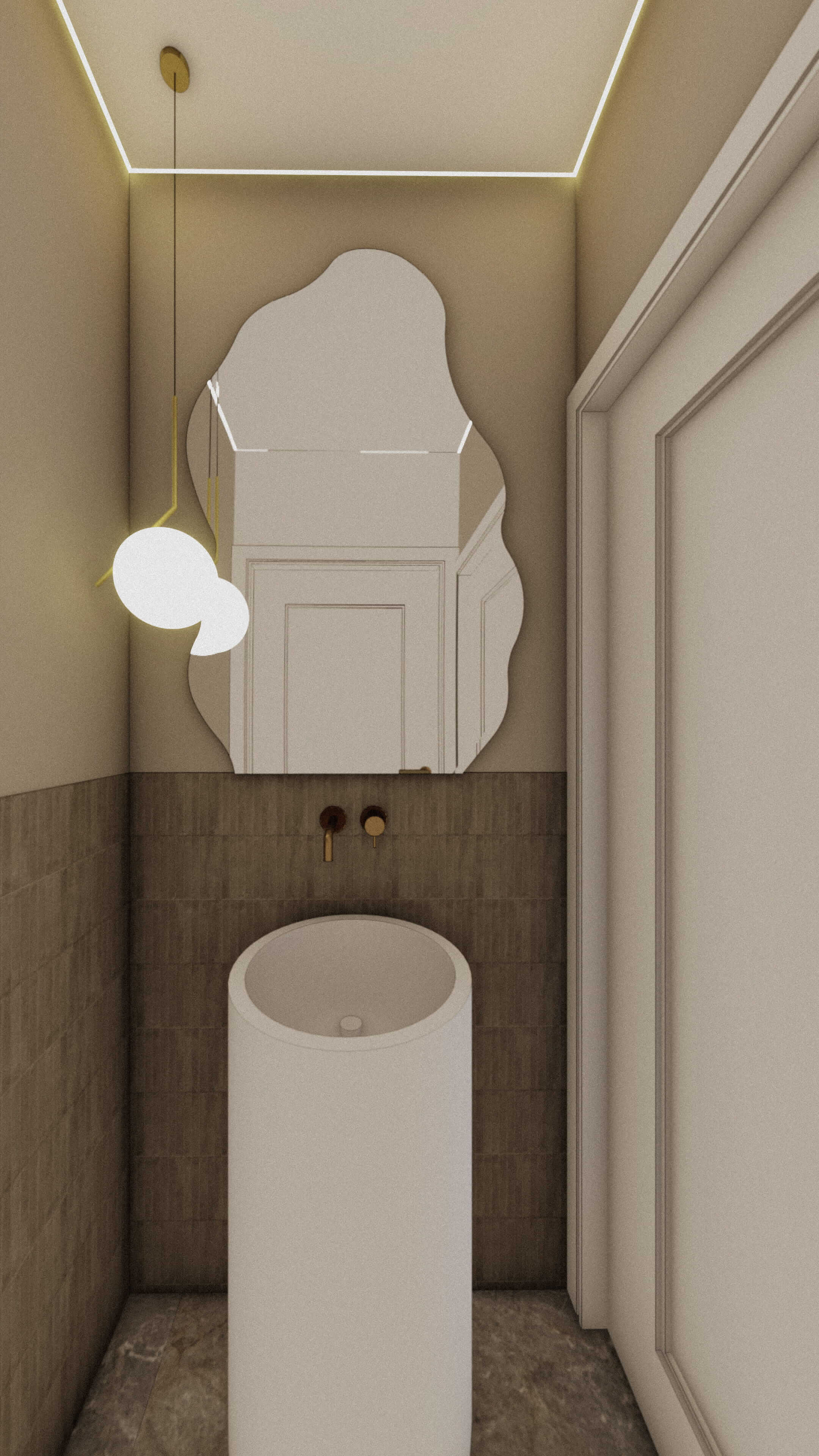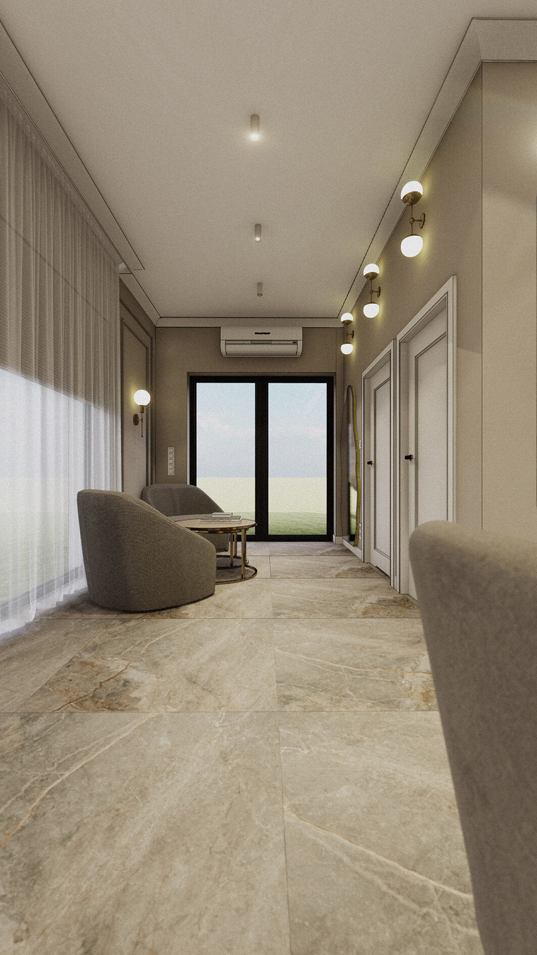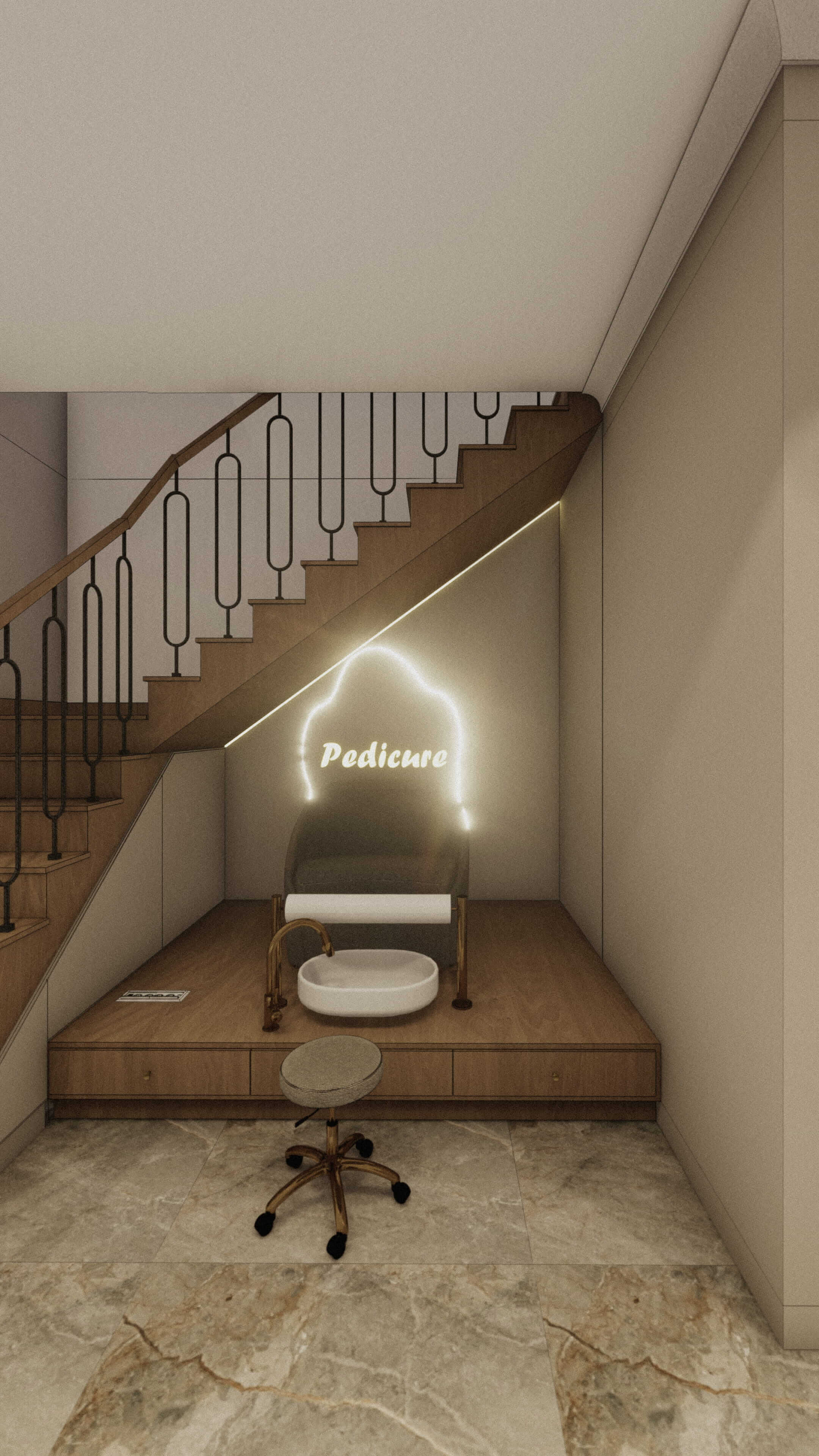 To elegancki gabinet będący wyraźną odskocznią od klasycznych bieli i różów w branży beauty. Nowoczesna kolorystyka, kamienne wykończenia i złote akcenty tworzą wnętrze z klasą, ale i charakterem. Przestrzeń jest spokojna i luksusowa, a jednocześnie zapadająca w pamięć. To projekt dla marek, które chcą wyróżnić się elegancją z pazurem.